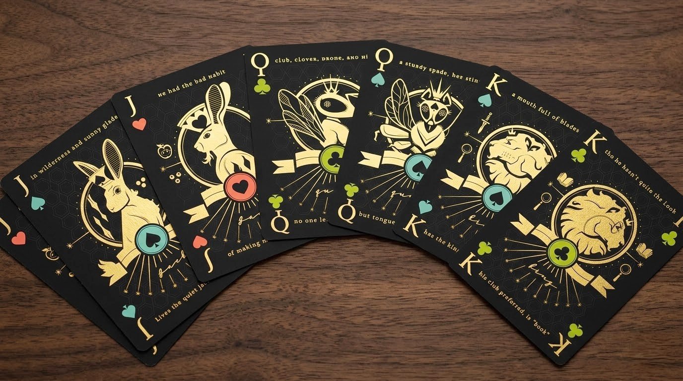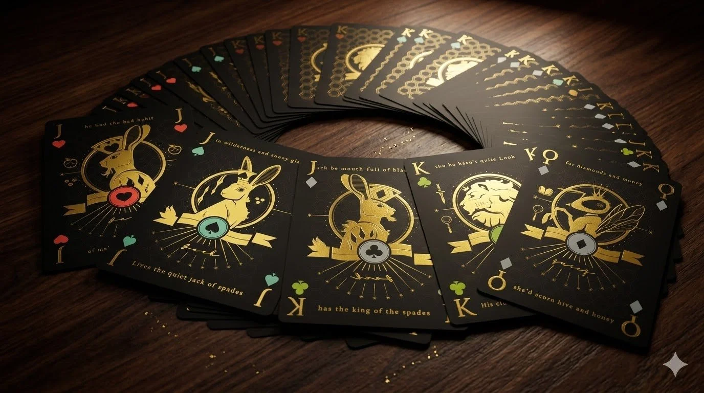 This playing card set was a personal passion project seeking to tell imaginative stories via the face cards themselves. The Kings would be portrayed as lions, the Queens as hornets, and the Jacks as rabbits. Each suit was further emphasized the character of each face determining them as a romantic, gentle and nature loving, violent, or greedy. The designs were illustrated first by hand, then in Adobe Illustrator. These visual comps were generated in Google Gemini to demonstrate how they would look printed in gold foil on matte black card stock.